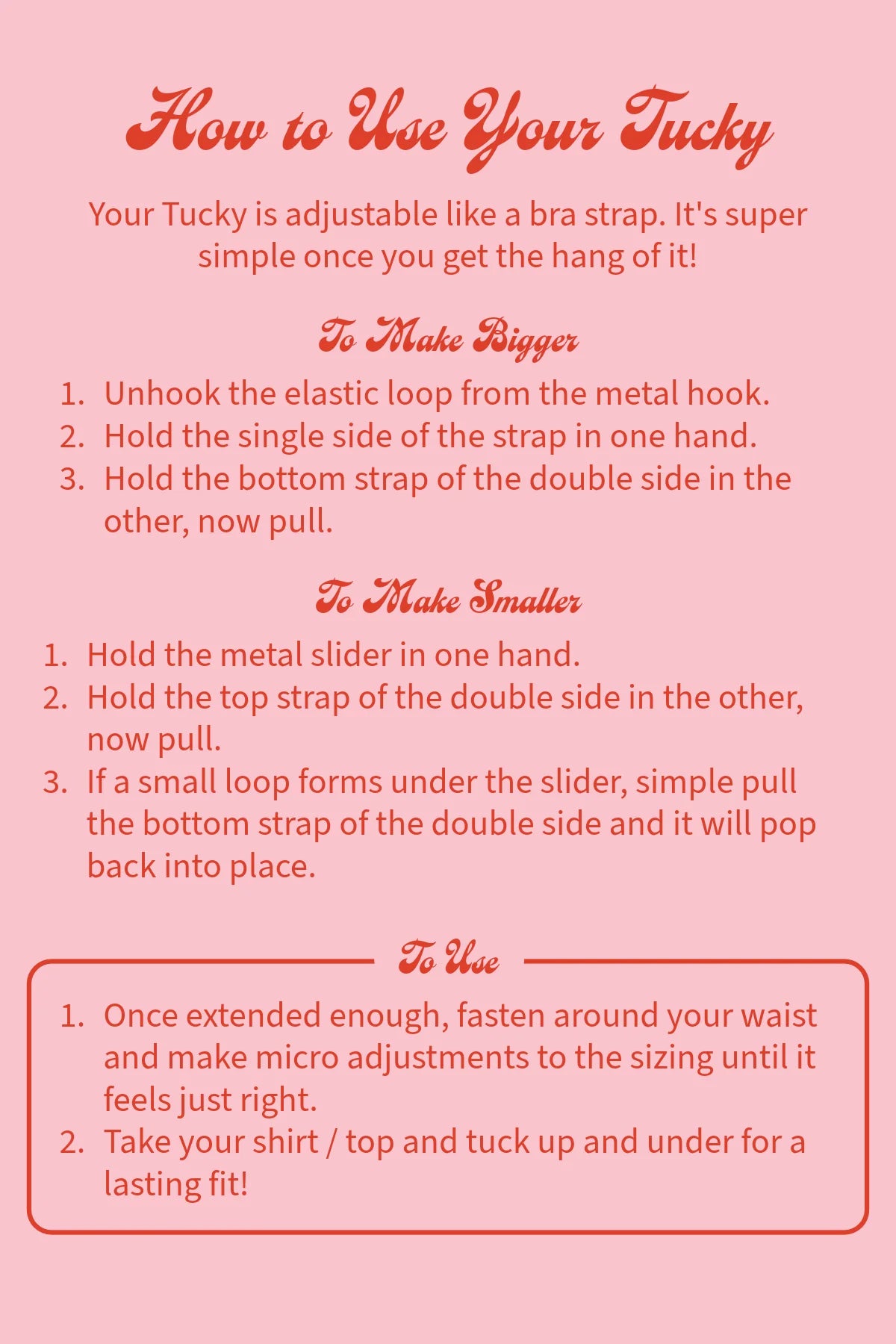 The Tucky is a revolutionary undergarment accessory that gives you the keys to unlock a new way of looking at your wardrobe! The strong but comfortable jacquard elastic strap is lined with two silicone strips to hold your tops in place all day. Tuck your tops into a crop, OR get the tucked in look without the bulk.